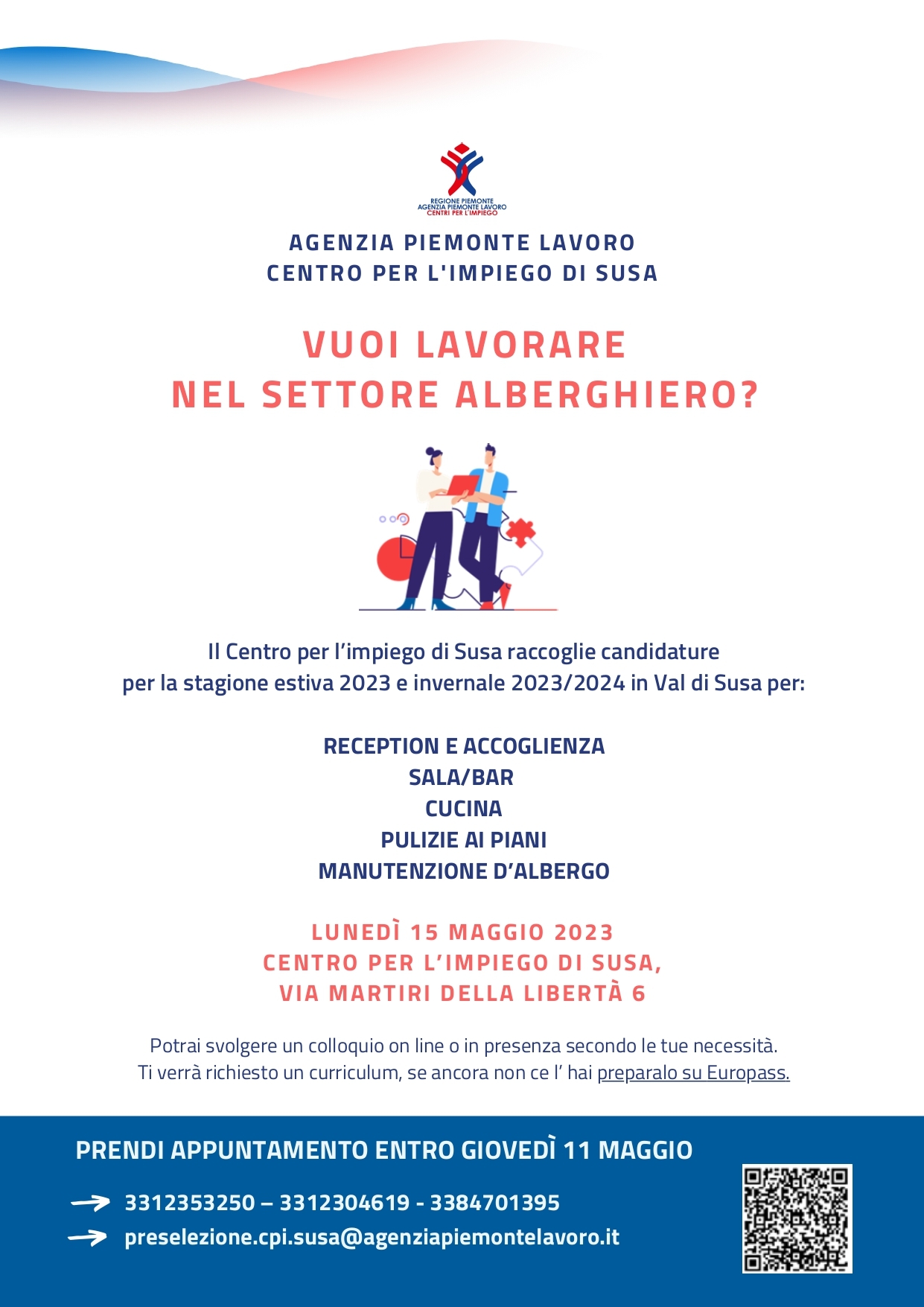 Lunedì 15 maggio 2023, presso il centro dell'Impiego di Susa in via Martiri della Libertà 6, si raccolgono candidature per la stagione estiva/invernale 2023-2024 per lavori nel settore alberghiero.