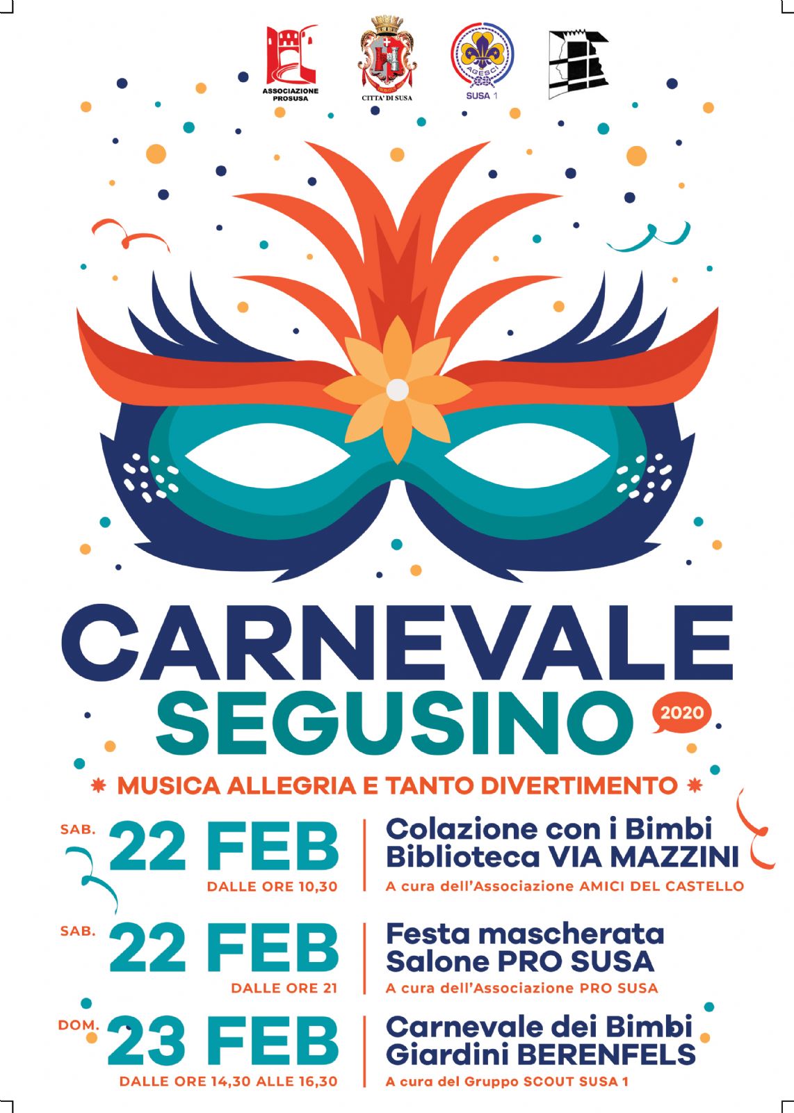 Due giorni di festa per il Carnevale Segusino dedicati soprattutto ai bimbi che potranno partecipare agli eventi: "Colazione con i bimbi" sabato 22 in Biblioteca e "Carnevale dei Bimbi" domenica 23 febbraio nei giardini di via Berenfels.
