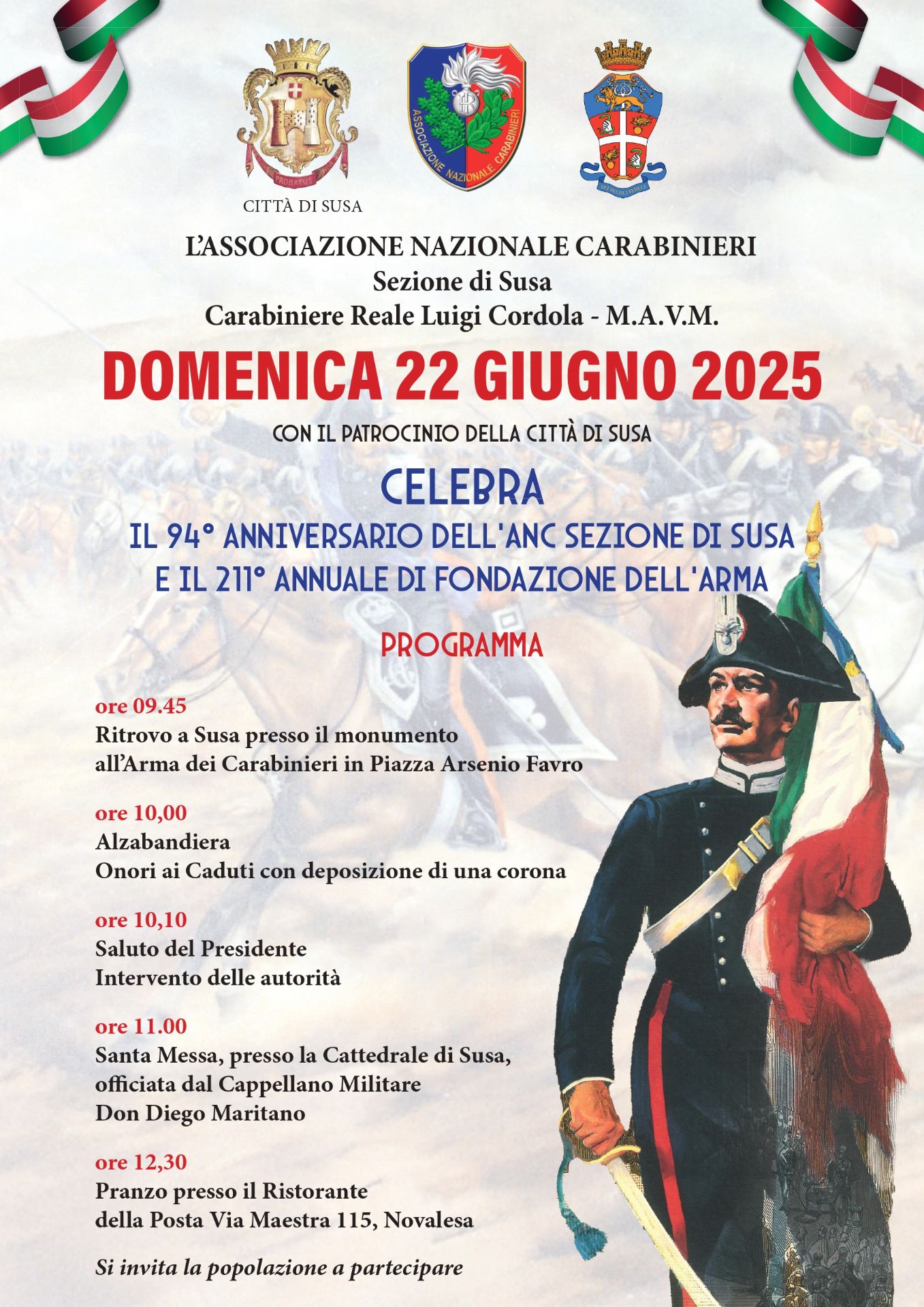 ore 11:00 Santa Messa, presso la Cattedrale di Susa, officiata dal Cappellano Militare Don Diego Maritano;