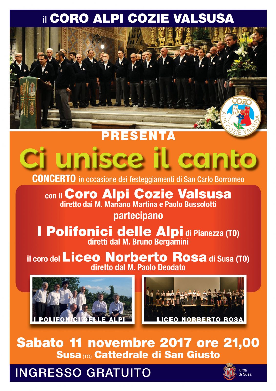 In occasione dei festeggiamenti di San Carlo Borromeo il Coro Alpi Cozie presenta sabato 11 novembre, alle ore 21.00 presso la Cattedrale di San Giusto "Ci unisce il canto", con la partecipazione di "I Polifonici delle Alpi" di Pianezza e del Coro del Liceo Norberto Rosa di Susa.