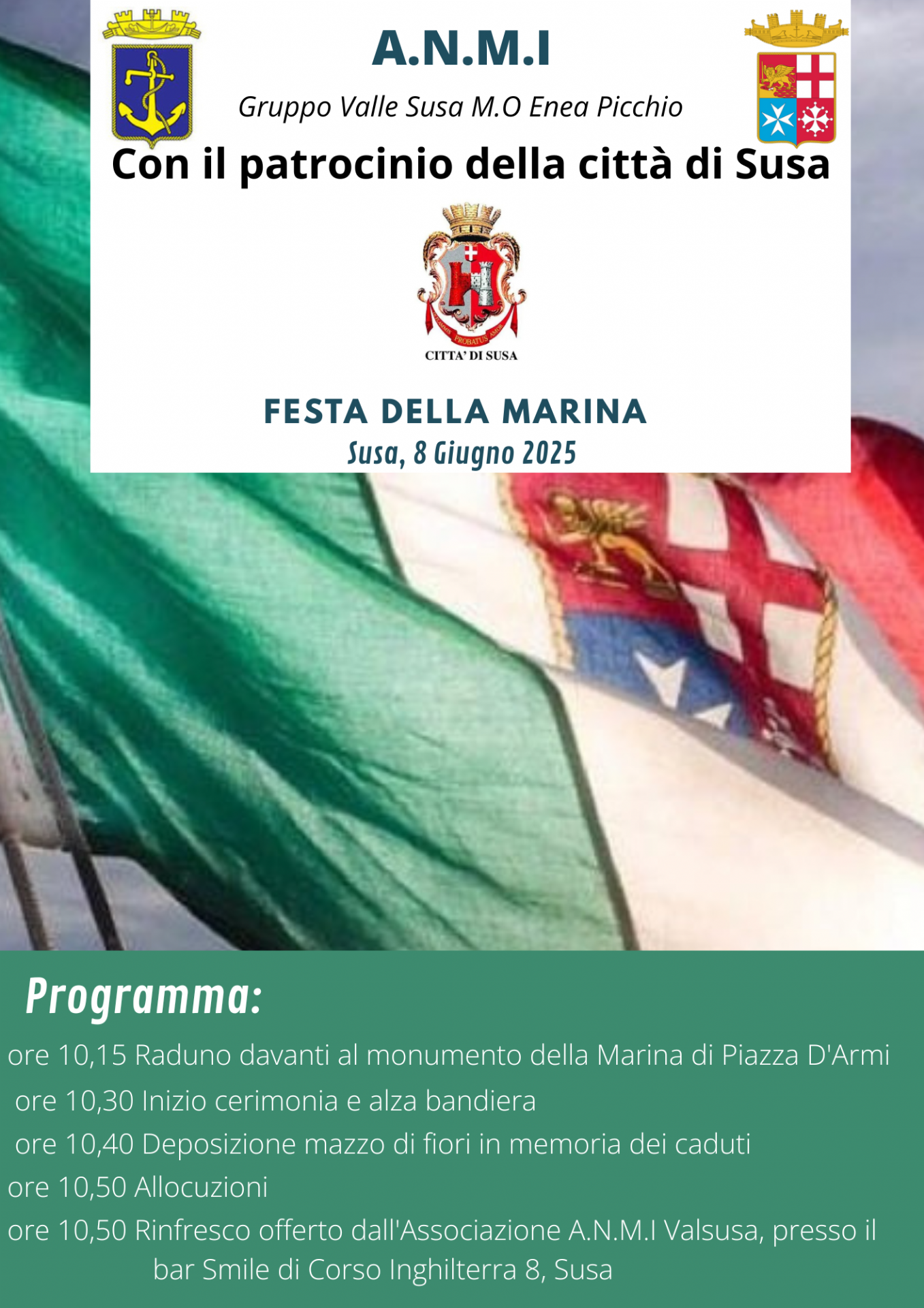 ore 10:50 - Rinfresco offerto dall'Associazione A.N.M.I. Val Susa presso il bar Smile di Corso Inghilterra 8, Susa.