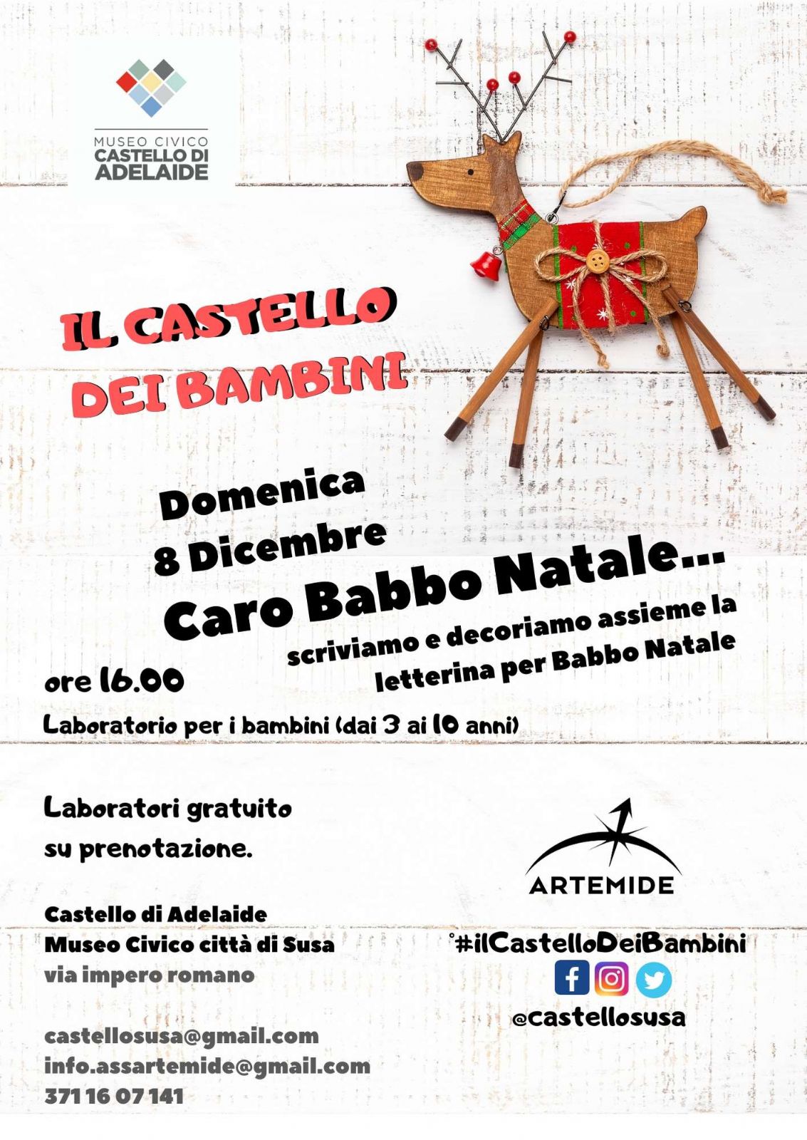 Domenica 8 dicembre, dalle ore 16.00, presso il Castello della Contessa Adelaide, avrà luogo il laboratorio per i bambini dai 3 ai 10 anni "Caro Babbo Natale .... Scriviamo e decoriamo assieme la letterina per Babbo Natale".