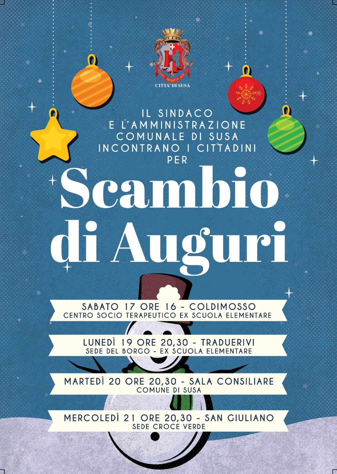Il Sindaco e L'Amministrazione comunale di Susa invitano i cittadini per lo scambio di auguri in occasione delle feste natalizie