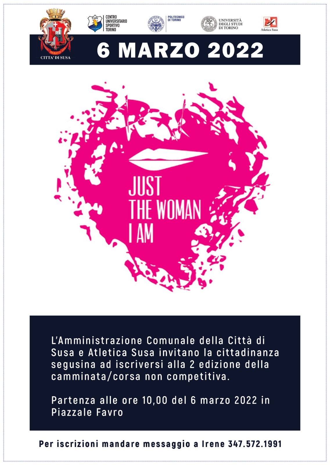 La Città di Susa, in collaborazione con Atletica Susa, aderisce nuovamente all’iniziativa Just the Woman I am, la nona edizione della manifestazione che promuove la prevenzione, i corretti stili di vita, l’inclusione e la parità di genere, organizzata dal Centro Universitario Sportivo torinese in collaborazione con l’Università degli Studi di Torino e il Politecnico di Torino,