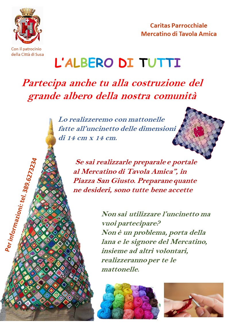 L'Albero di Tutti, a cura della Caritas Parrocchiale e con il patrocinio della Città di Susa, è stato realizzato grazie a quanti hanno collaborato alla creazione delle mattonelle di lana, un gesto che aiuterà le persone in difficoltà.
