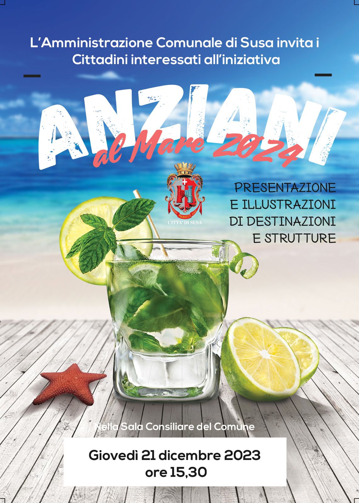 l'Amministrazione Comunale di Susa invita i Cittadini interessati all'iniziativa "Anziani al Mare 2024" alla presentazione ed illustrazione delle possibili destinazioni e strutture