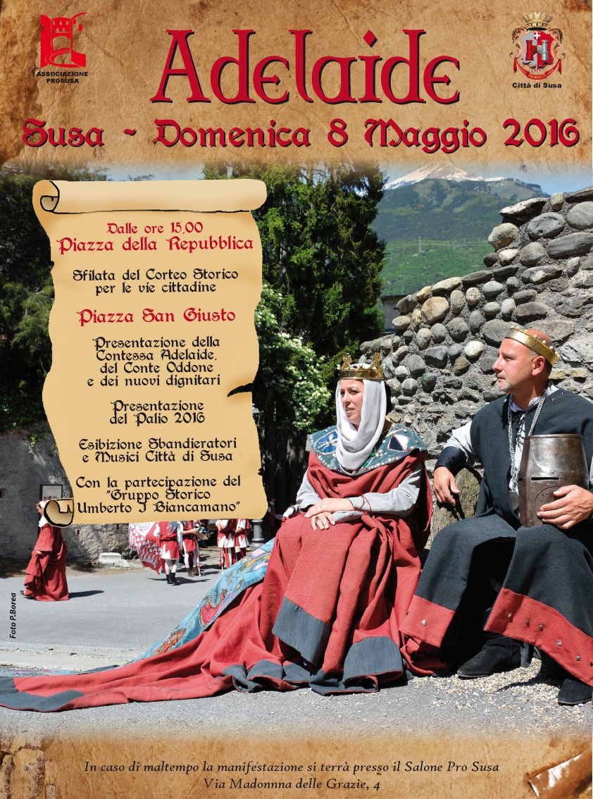 Domenica 8 maggio, a partire dalle ore 15.00, Susa presenterà Adelaide, la Contessa che presenzierà il Torneo Storico dei Borghi 2016, il Conte Oddone e i dignitari.
