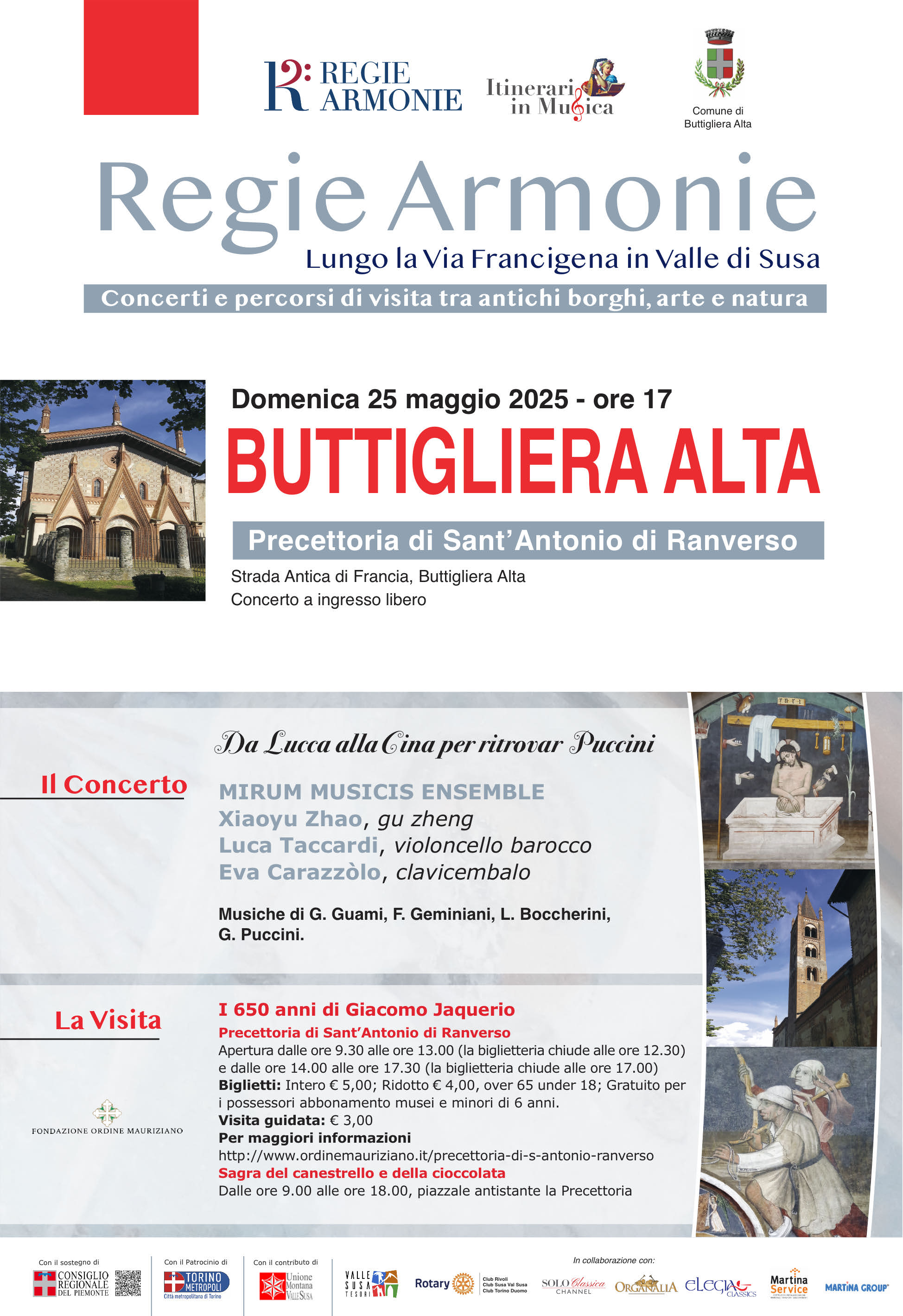 Ripartiranno sabato 24 maggio, a Sant’Ambrogio di Torino, e domenica 25 a Buttigliera Alta i concerti dell’edizione 2025 di “Regie Armonie Lungo la Via Francigena”: appuntamenti musicali e percorsi di visita tra antichi borghi, arte e cultura. Un progetto di Itinerari In Musica per valorizzare e riscoprire il patrimonio storico, artistico e culturale del territorio in modo inclusivo e adatto ad un pubblico ampio e variegato.