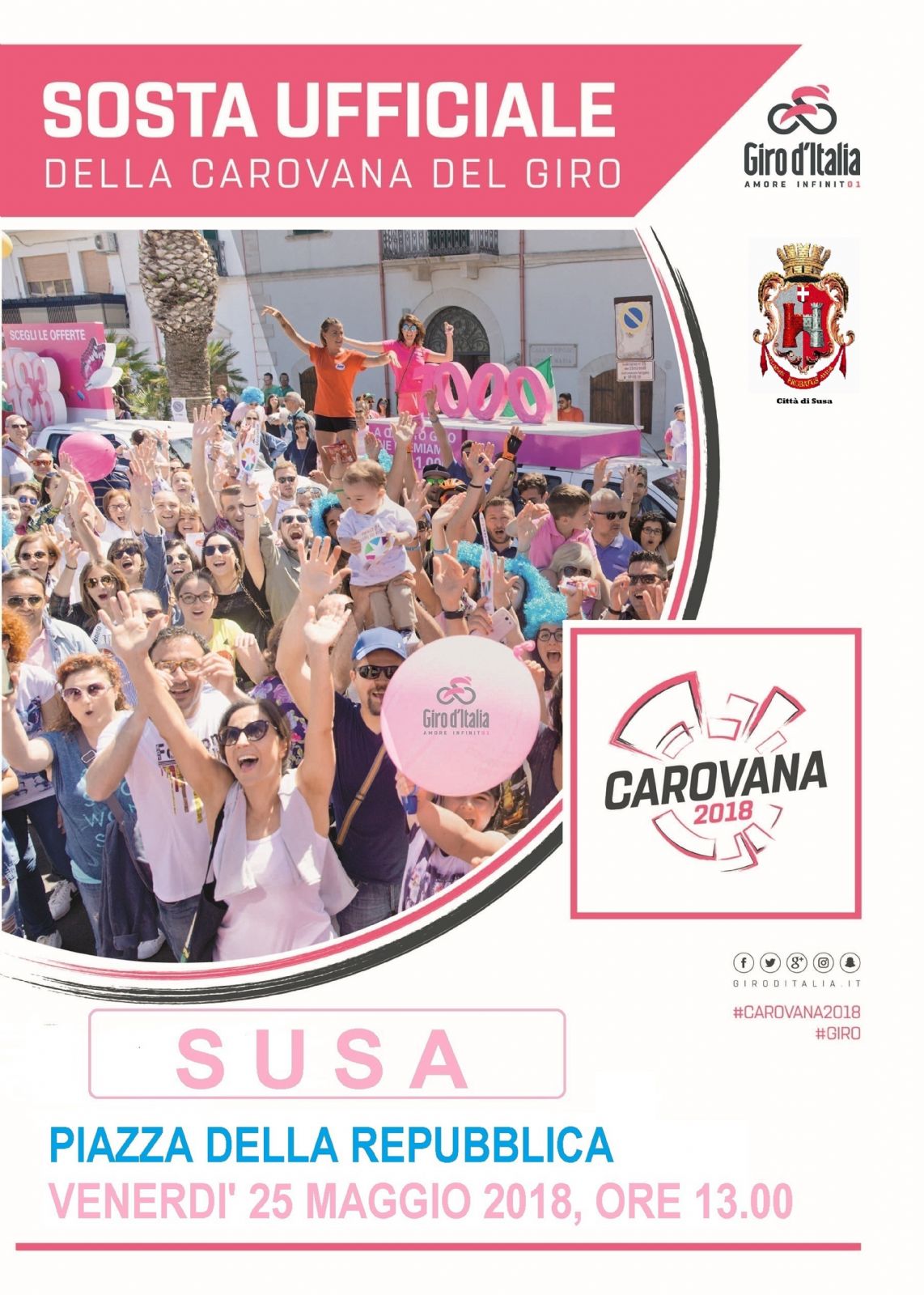 In data venerdì 25 maggio avrà luogo la 19^ tappa del Giro d’Italia Venaria Reale-Bardonecchia. In tale occasione la Carovana Ufficiale giungerà a Susa, in Piazza della Repubblica attorno alle ore 13.00 circa.