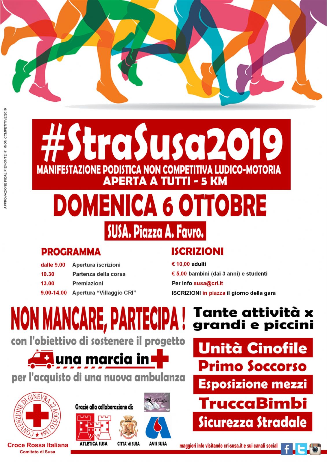 Domenica 6 ottobre avrà luogo l'edizione 2019 della StraSusa, gara podistica non competitiva organizzata Comitato di Susa della Croce Rossa Italiana, in collaborazione con l'Atletica Susa e con il patrocinio della Città di Susa.