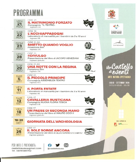 Fitto programma di eventi organizzati presso il cortile del Castello di Adelaide per il periodo 21 agosto / 25 settembre. In calendario: il teatro, il laboratorio per bambini, il cinema, la presentazione libri, l'opera e la giornata dell'archeologia.