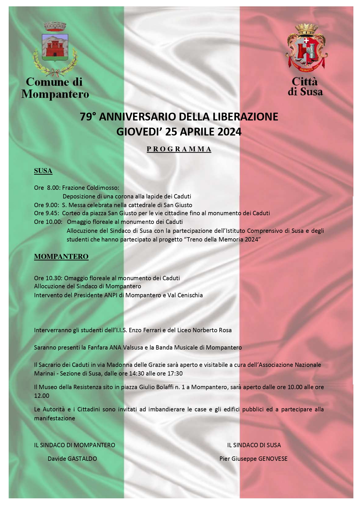 ore 10.00 Omaggio floreale al monumento dei Caduti, Allocuzione del Sindaco di Susa, con la partecipazione dell'Istituto Comprensivo di Susa e i ragazzi che hanno partecipato al progetto "Treno della Memoria 2024"