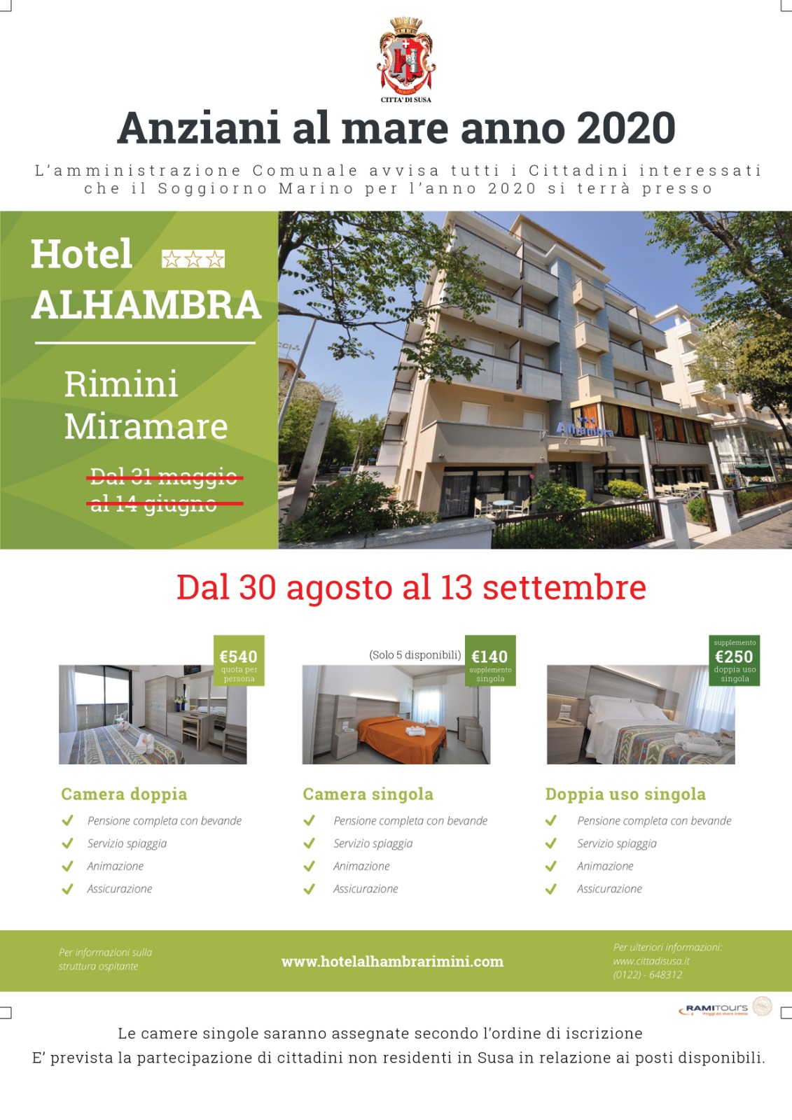 Il soggiorno marino 2020 si terrà c/o l'Hotel Alhambra di Rimini Miramare dal 30 agosto al 13 settembre.