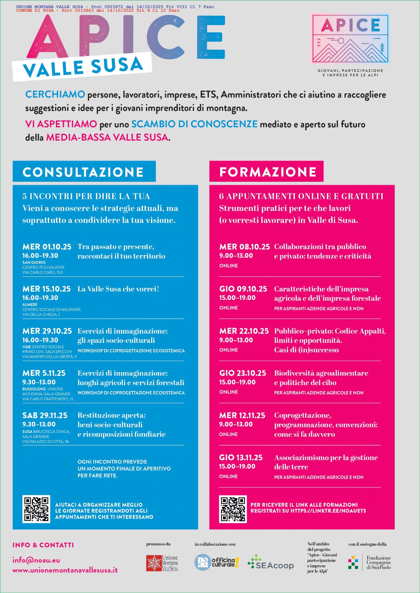 Gli incontri di consultazione fanno parte del progetto “Apice – Giovani, partecipazione e imprese per le Alpi” della Fondazione Compagnia di San Paolo, gestito dall’Unione Montana Valle Susa in collaborazione con Noau – Officina Culturale e Seacoop.