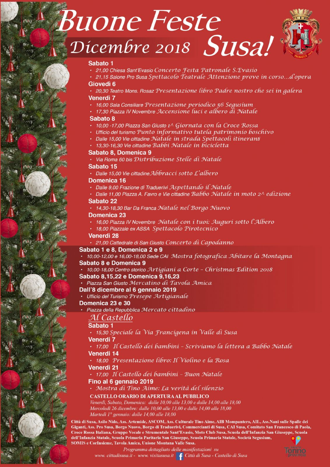 Nel materiale pubblicitario dei singoli eventi, organizzati e patrocinati dalla Città di Susa, sarà specificato il programma dettagliato.