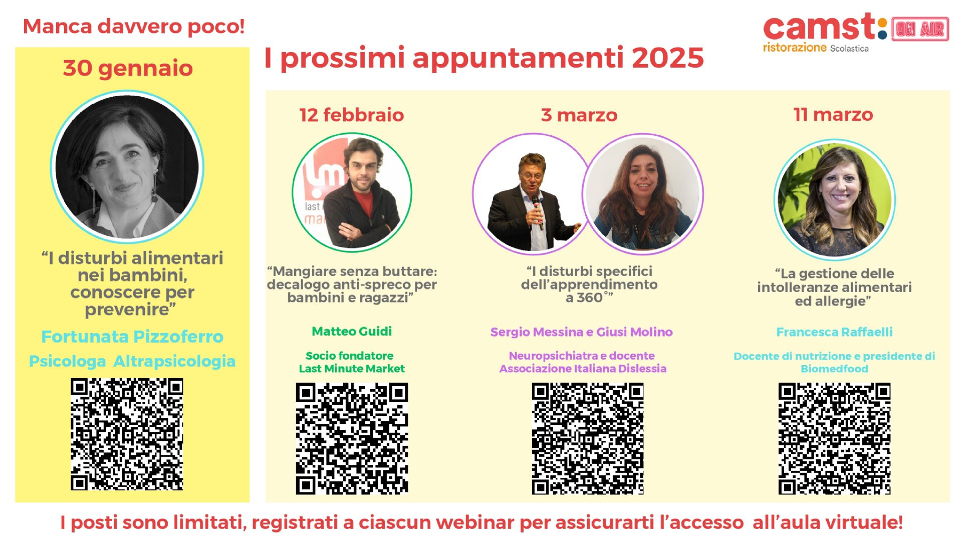 Con l’inizio del nuovo anno parte il progetto "Camst on air" dedicato alle famiglie, un ciclo di webinar a cura della ditta Camst (che ha in carico il servizio di refezione scolastica) per approfondire argomenti di grande attualità legati all’alimentazione sana, all’educazione scolastica e al benessere dei bambini, grazie alla guida di esperti.