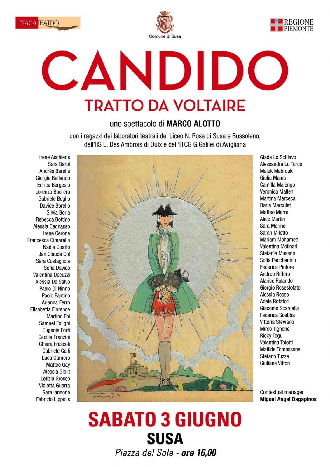 Sabato 3 giugno, alle ore 16.00, in piazza del Sole, avrà luogo lo spettacolo teatrale "Candido", tratto da Voltaire, con la regia di Marco Alotto e la partecipazione dei ragazzi dei laboratori teatrali del Liceo Norberto Rosa di Susa e Bussoleno, dell'IIS L. Des Ambrois di Oulx e dell'ITCG G.Galilei di Avigliana.