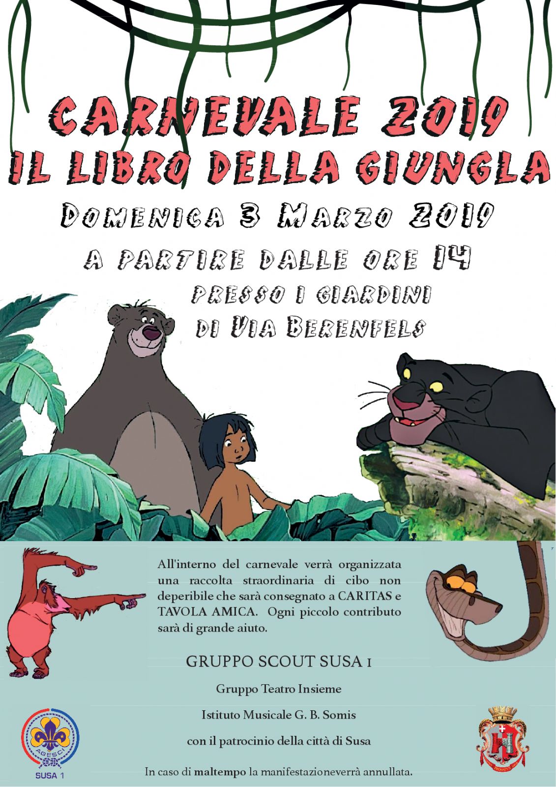 Domenica 3 marzo, a partire dalle ore 14.00, presso i giardini di Via Berenfels, il Gruppo Scout Susa I, in collaborazione con il Gruppo Teatro Insieme, l'Istituto Musicale G.B. Somis, organizza per i bimbi il Carnevale 2019 "Il libro della giungla".