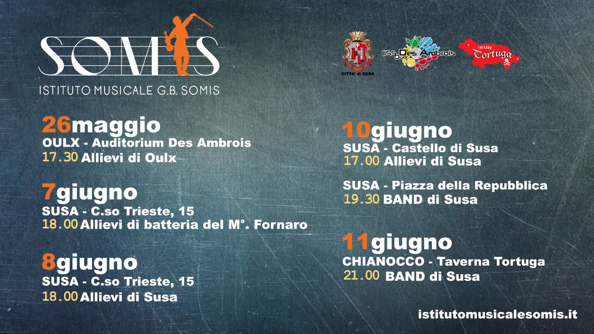 Ad iniziativa annullata a causa del maltempo il 21 maggio, i saggi di fine anno che verranno realizzati a Susa dall'Istituto Musicale G.B. Somis, con il patrocinio della Città di Susa, si svolgeranno nei seguenti giorni: