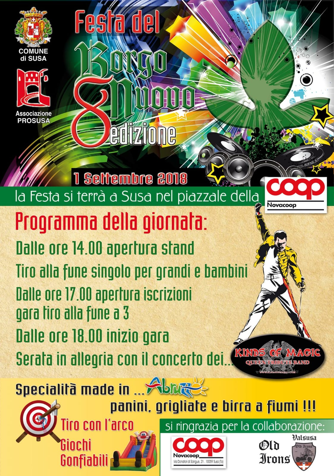 Dalle ore 14.00 apertura stand, tiro con l'arco, tiro alla fune e concerto finale dei Kinds of Magic.