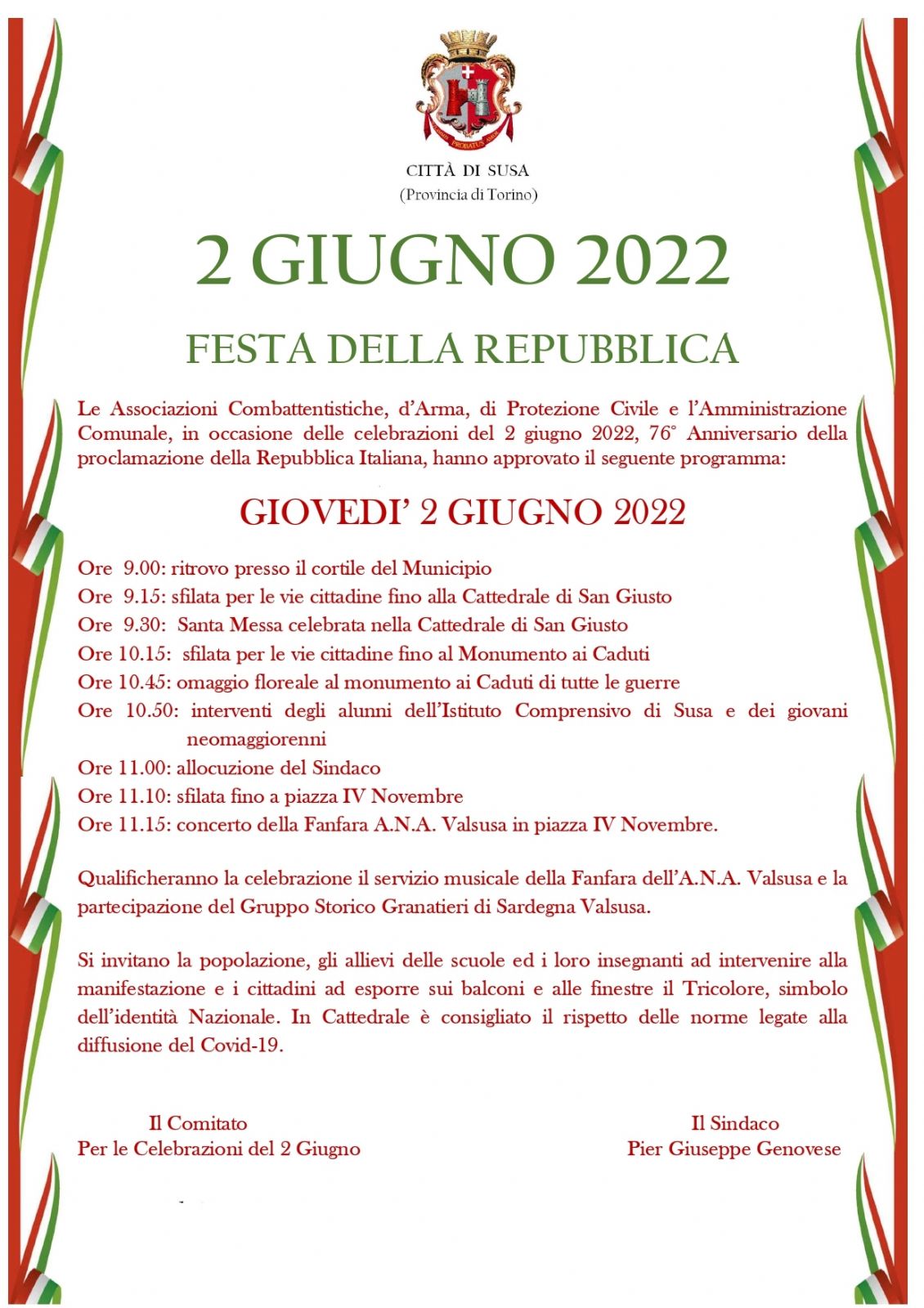 In allegato il programma approvato dal Comitato per le Celebrazioni del 2 giugno e dalla Città di Susa.