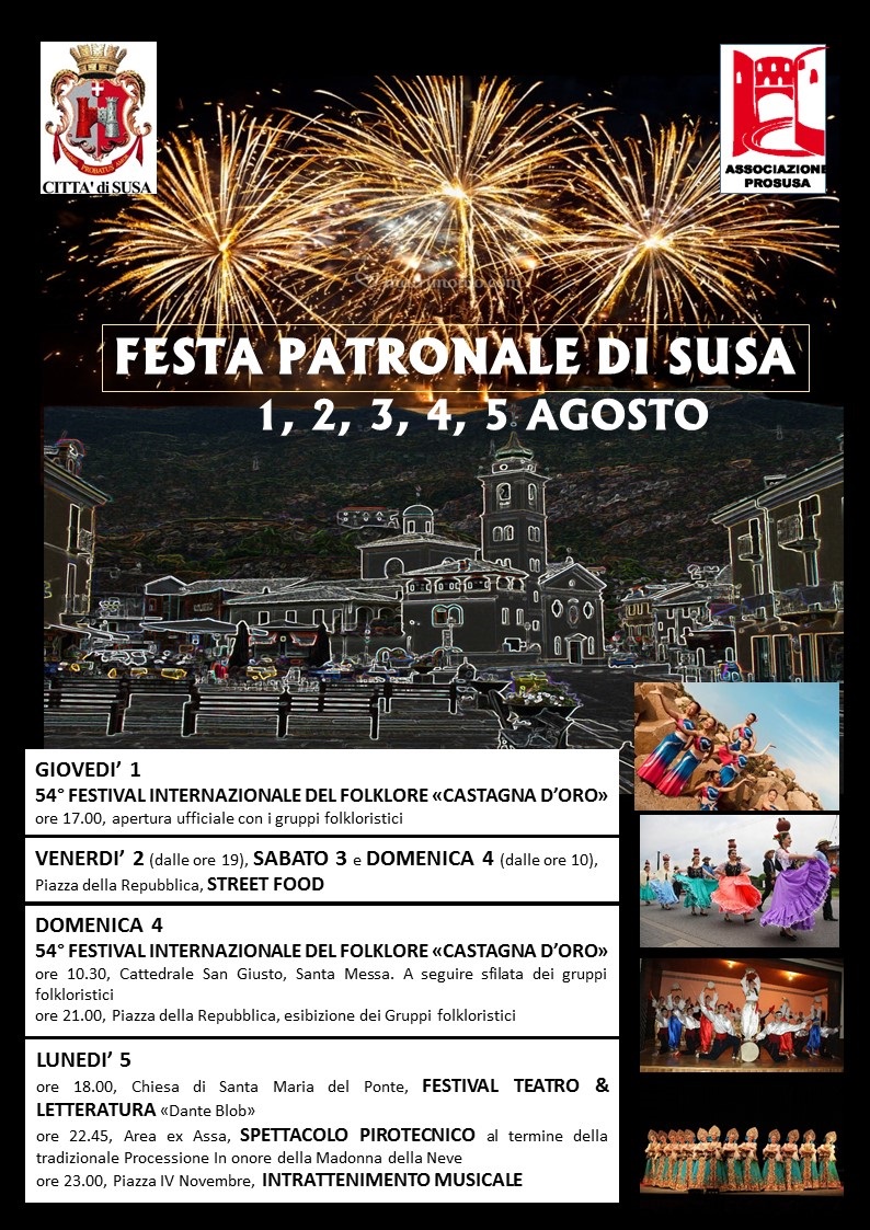 La Città di Susa, in collaborazione con l'Associazione Pro Susa, presenta il calendario degli eventi organizzati in occasione della festa Patronale del 5 agosto: