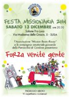 Sabato 13 dicembre 2014, alle ore 21, si terrà presso il Salone Mons. Rosaz, la Festa Missionaria 2014, organizzata dall'Associazione Mission Beato Rosaz o.n.l.u.s. e dalle Suore Francescane Missionarie di Susa.