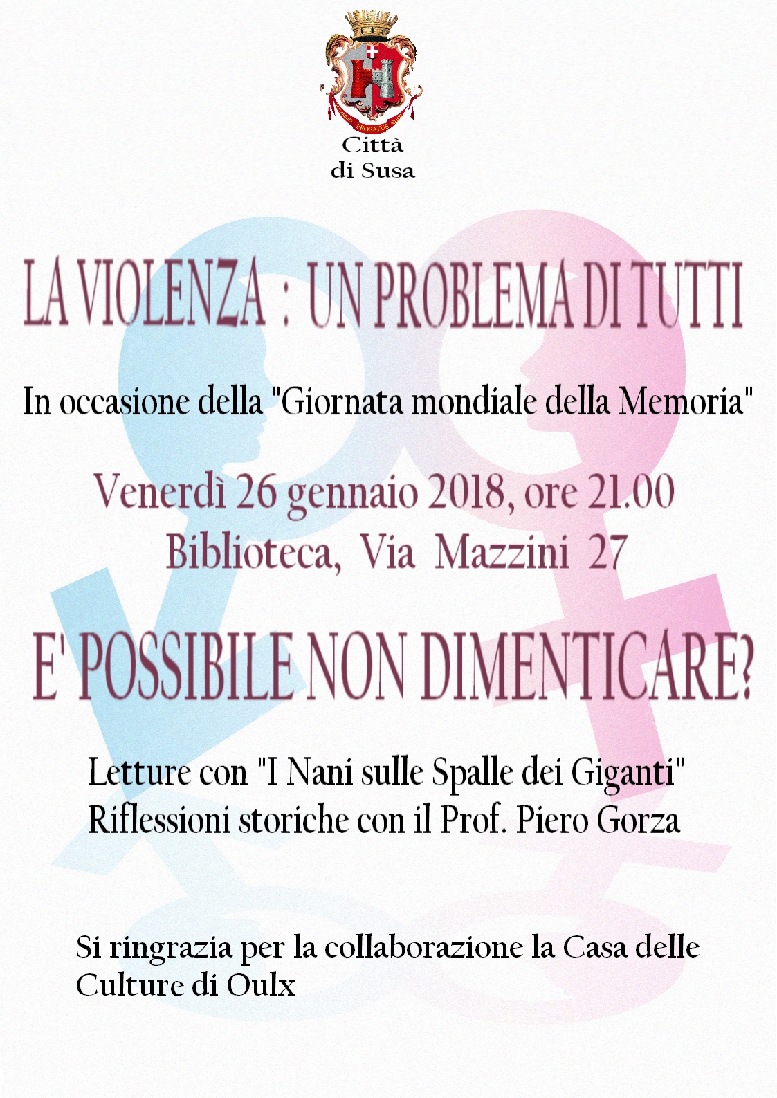 La violenza: un problema di tutti. In occasione della Giornata mondiale della Memoria si terrà venerdì 26 gennaio 2018, alle ore 21.00, c/o la Biblioteca un incontro dal titolo "E' possibile non dimenticare?".