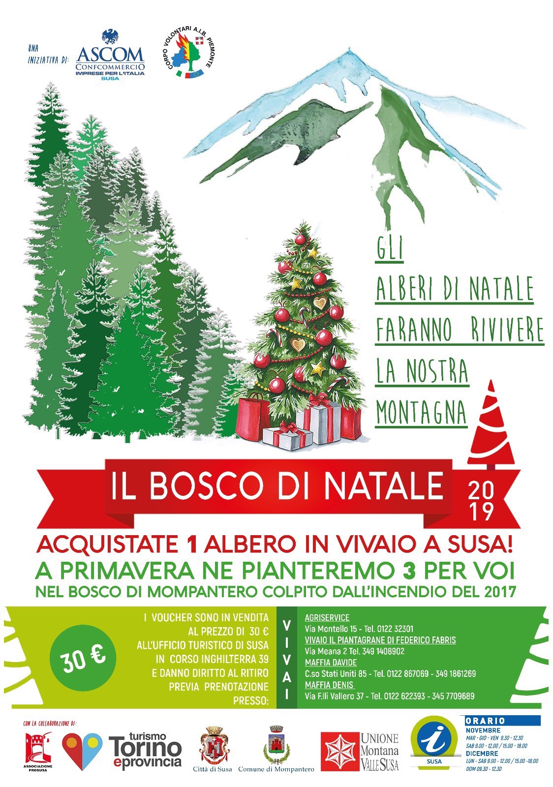 In occasione delle prossime festività, su iniziativa dell'Ascom Susa e del Corpo Volontari A.I.B. Piemonte, in collaborazione con l'Associazione Pro Susa, Turismo Torino e Provincia, Città di Susa, Comune di Mompantero, Unione Montana Valle Susa, verrà realizzato il progetto "Bosco di Natale 2019".