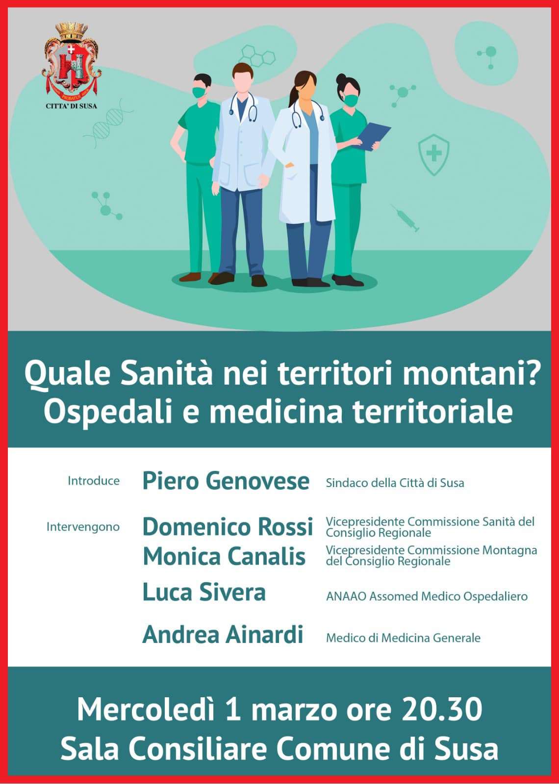 Mercoledi' 1 marzo, alle ore 20.30, nella Sala Consiliare della Città di Susa si terrà un interessante incontro sulle prospettive dei servizi sanitari ospedalieri e territoriali nelle aree montane.