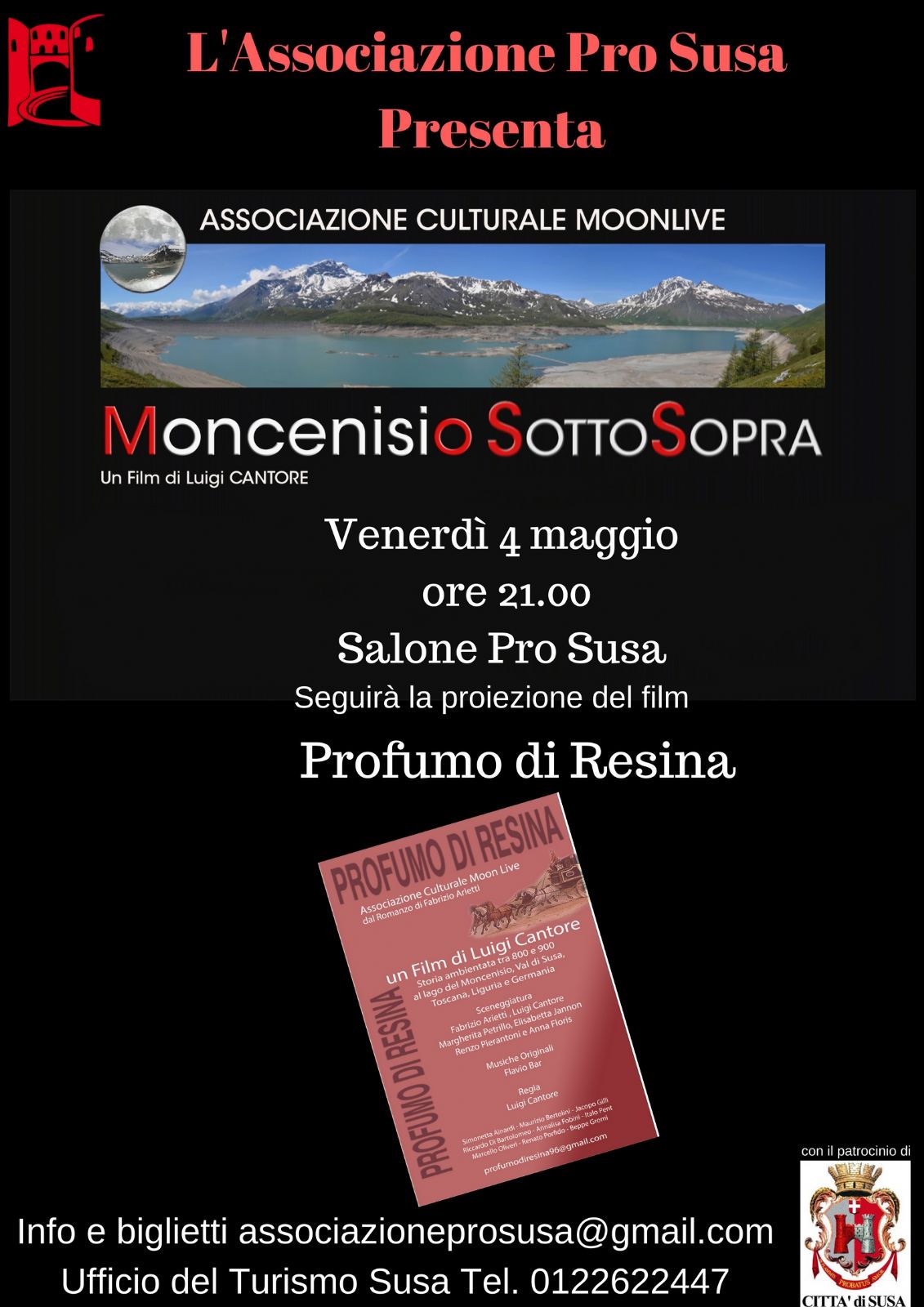 Venerdì 4 maggio, alle ore 21.00, l'Associazione Pro Susa, nell'ambito della manifestazione "Susa dai mille colori" organizza l'evento "Moncenisio SottoSopra" - "Profumo di resina", con proiezione di film, come indicato nell'allegata locandina.