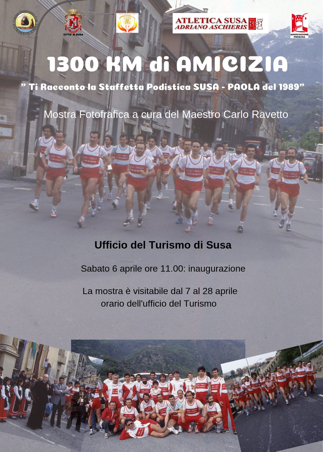 Sabato 6 aprile verrà inaugurata, presso l'Ufficio del Turismo di Susa, alle ore 11.00 la mostra fotografica 1300 Km. di amicizia "Ti racconto la Staffetta Podistica Susa - Paola del 1989", a cura del Maestro Carlo Ravetto.
