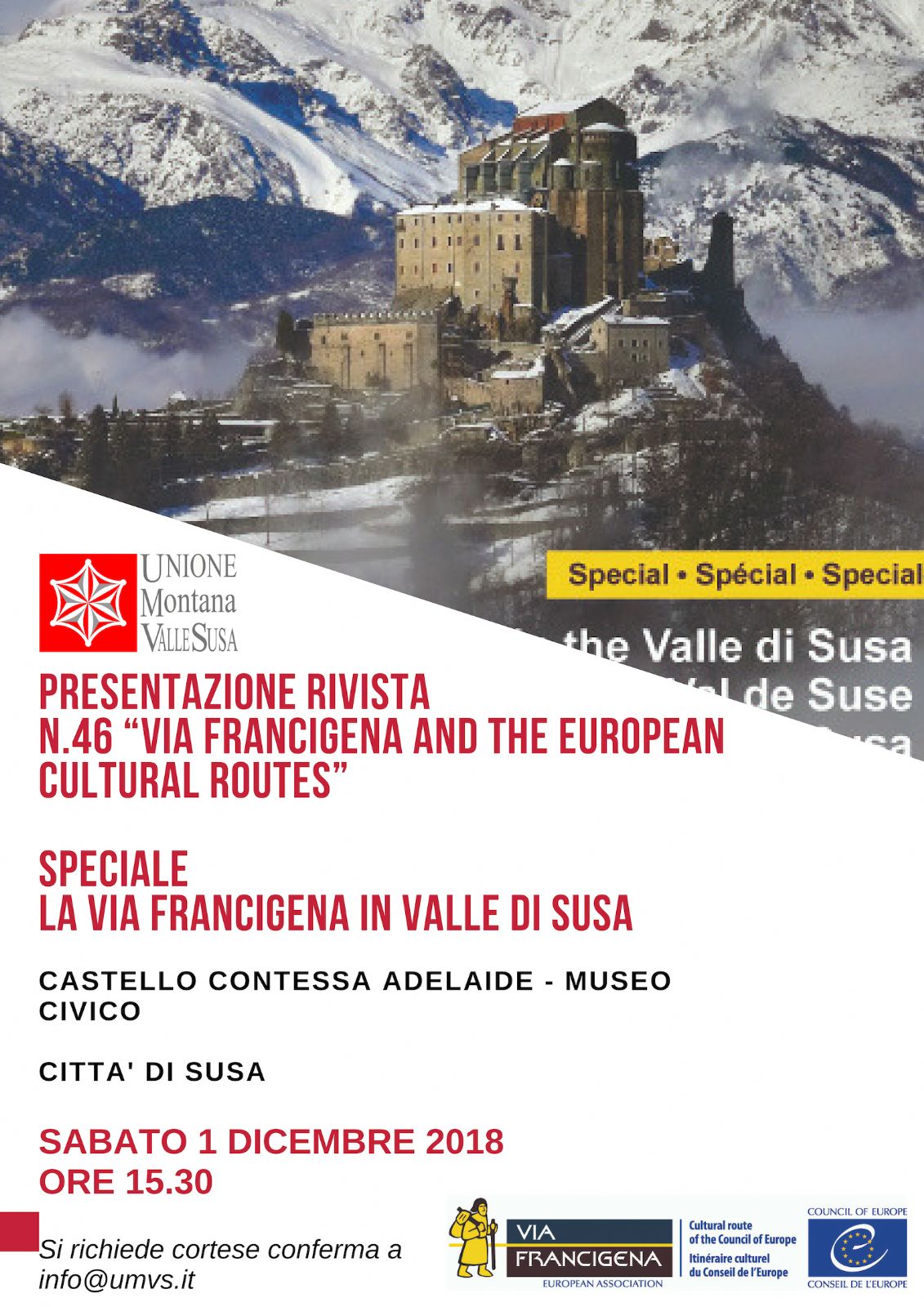 Sabato 1° dicembre, a partire dalle ore 15.30, nelle sale del Castello, si terrà la presentazione della rivista n. 46 "Via Francigena and the European Cultural Routes" - Speciale La Via Francigena in Valle di Susa.