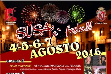 "Susa: è festa!!!" quest'anno entra in scena con due grandi novità: la prima l'inserimento del Festival Internazionale del Folklore, la seconda l'ingresso libero per tutte le serate, compresa...