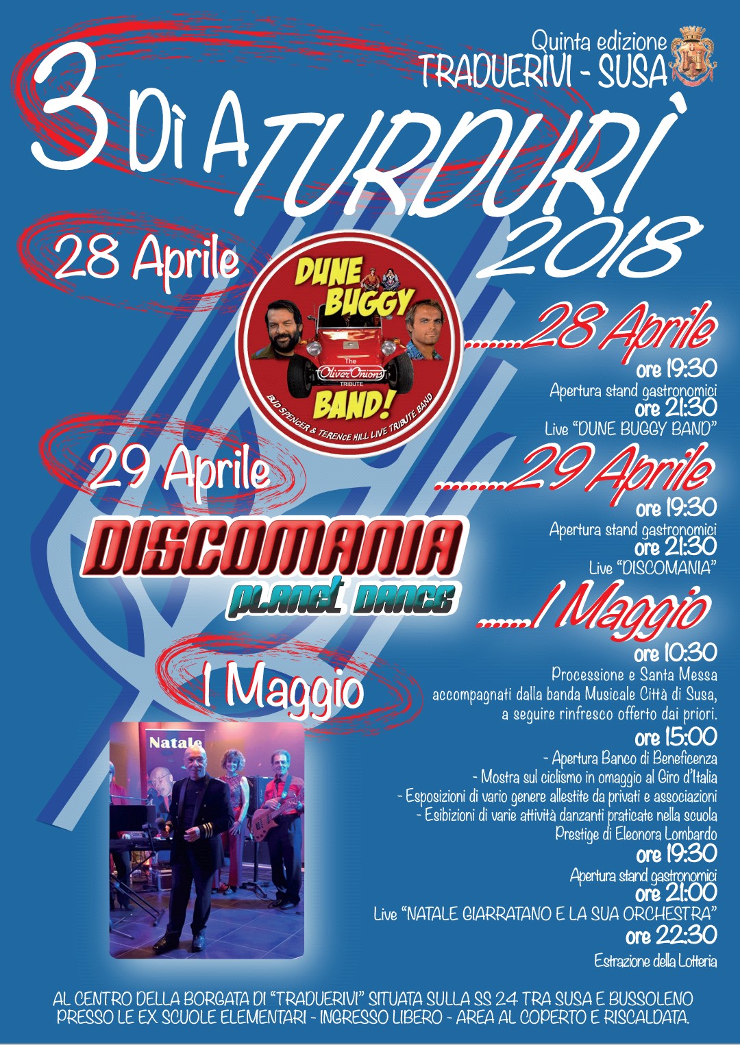 Sabato 28 e domenica 29 aprile e martedì 1° maggio, presso l'ex scuola elementare di Traduerivi, avrà luogo la quinta edizione della manifestazione "Tre dì a Turdurì".