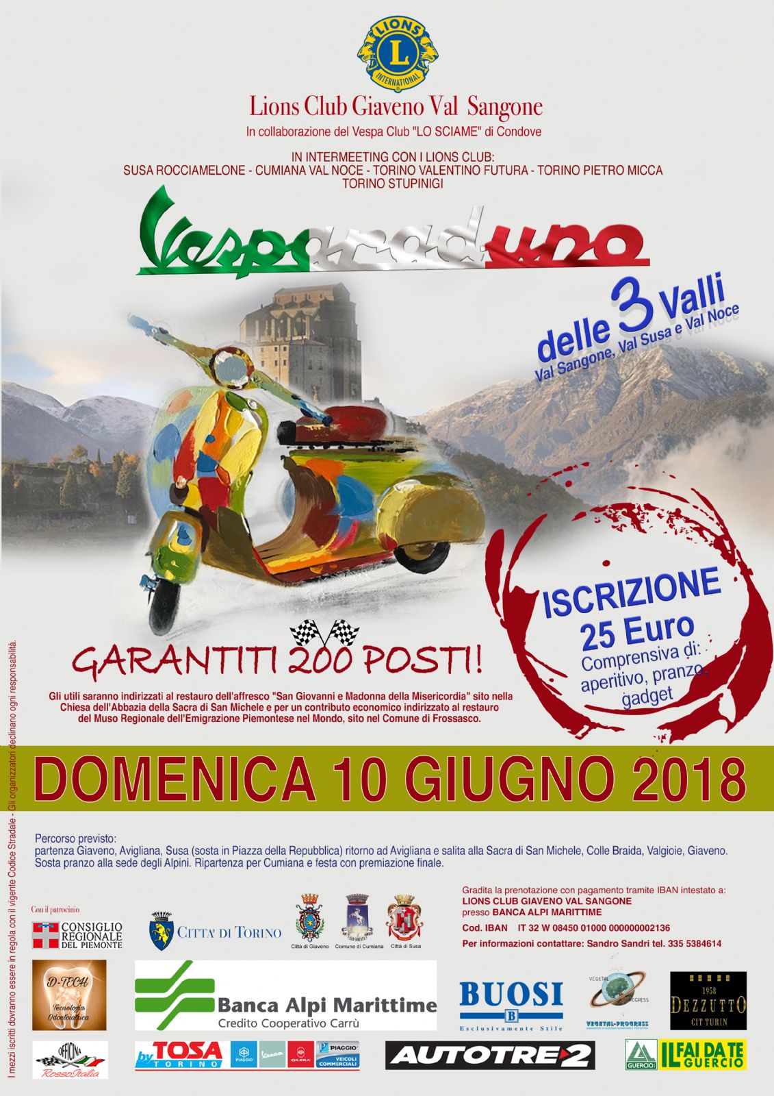 Per domenica 10 giugno Lions Club Susa Rocciamelone, Giaveno Val Sangone, Cumiana Val Noce organizzano la manifestazione "Vesparaduno delle tre Valli". L'obiettivo del raduno è quello di raccogliere i fondi per realizzare il restauro del più importante affresco cinquecentesco esistente nella Chiesa dell'Abbazia della Sacra di San Michele "San Giovanni e Madonna della Misericordia" e per la ristrutturazione del Museo Regionale dell'Emigrazione dei Piemontesi nel Mondo sito nel Comune di Frossasco.