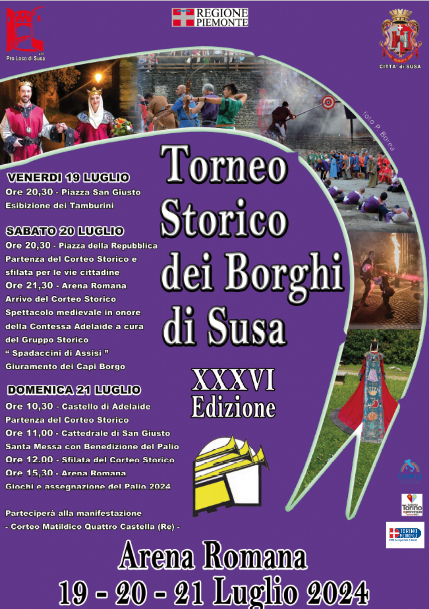 Un corteo storico composto da centinaia di comparse in abiti medievali curati nei particolari, due cornici fantastiche: il Castello della Contessa Adelaide e l’Arena Romana, incastonati tra le Alpi Cozie e sovrastati dall’imponente Monte Rocciamelone.