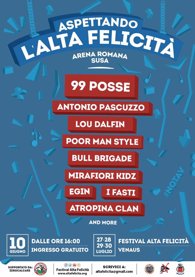 L'Associazione Alta Felicità organizza sabato 10 giugno, a partire dalle ore 16.00, con ingresso gratuito, presso l'Arena Romana di Susa, un concerto dal titolo "Aspettando l'Alta Felicità", il cui Festival avrà luogo a Venaus dal 27 al 30 luglio.