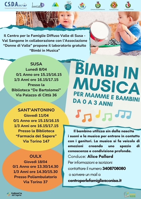Il Centro per le famiglie Diffuso Valle di Susa-Val Sangone in collaborazione con l'Associazione "Donne di Valle" propone il Laboratorio gratuito "Bimbi in Musica"