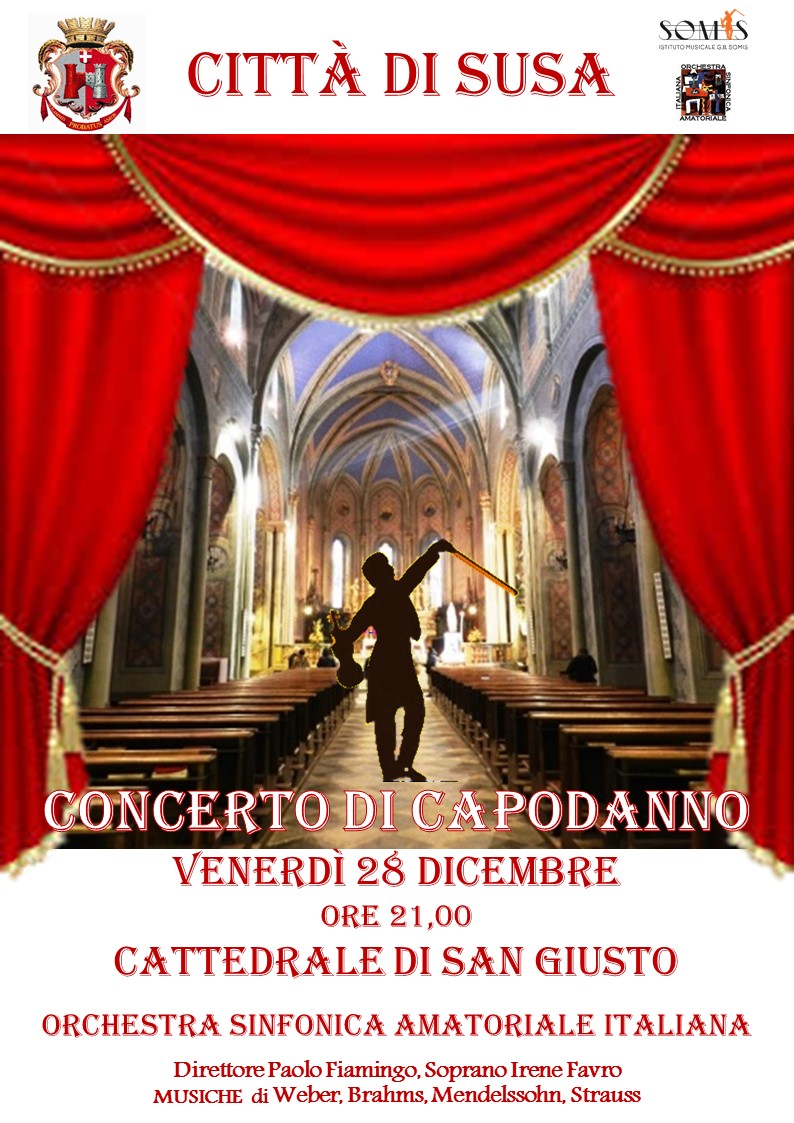 Venerdì 28 dicembre, alle ore 21.00, nella Cattedrale di San Giusto, avrà luogo il Concerto di Capodanno, organizzato dalla Città di Susa in collaborazione con l'istituto Musicale G.B. Somis.