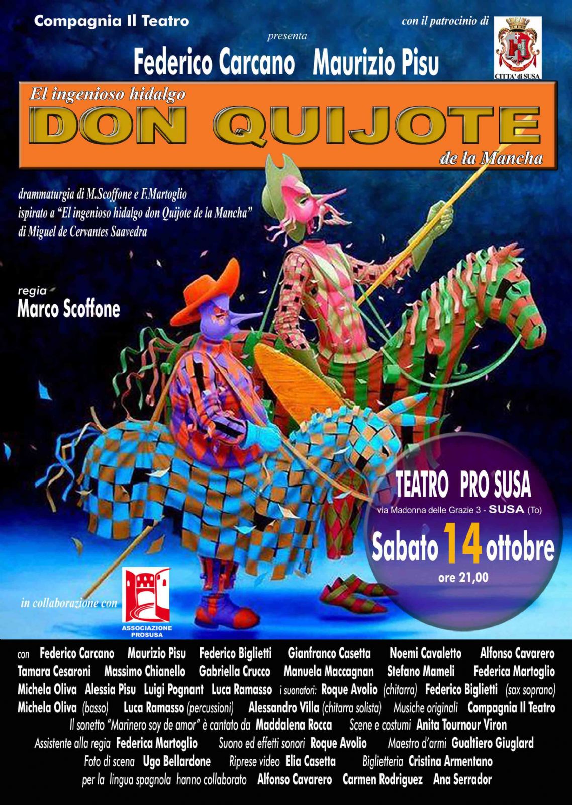 Sabato 14 ottobre, alle ore 21.00, presso il Teatro Pro Susa, avrà luogo lo spettacolo teatrale "El ingenioso hidalgo don Quijote de la Mancha", versione spagnola di "Don Chisciotte della Mancia", opera letteraria tra le più importanti nella storia della letteratura mondiale.
