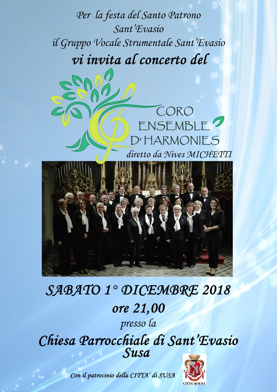 In occasione della Festa del Santo Patrono, il Gruppo Vocale Strumentale Sant'Evasio organizza per sabato 1° dicembre, alle ore 21.00, il concerto del Coro Ensemble d'Harmonies diretto da Nives Michetti.