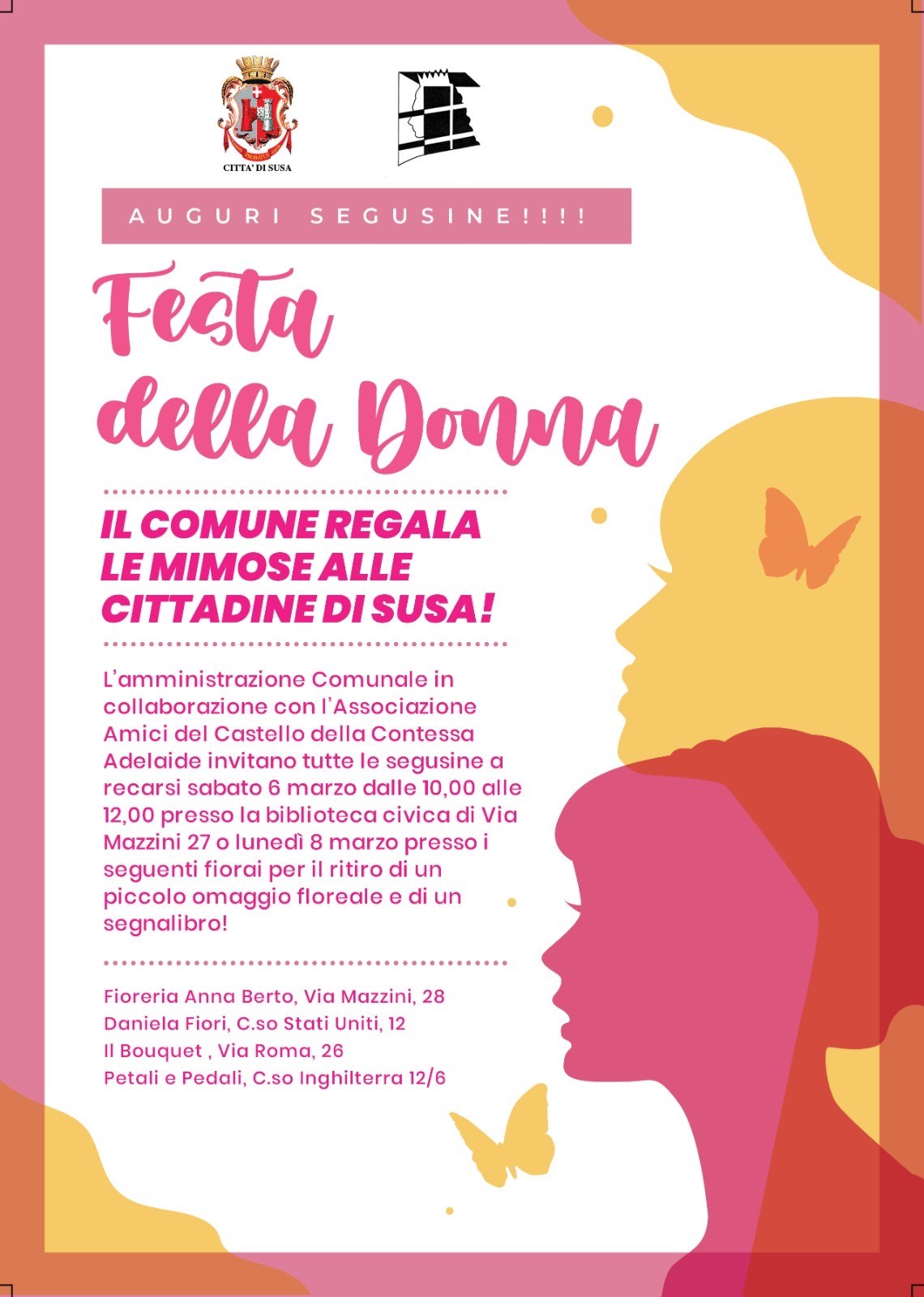 In occasione della Festa della Donna, l'Amministrazione Comunale, in collaborazione con l'Associazione Amici del Castello della Contessa Adelaide, invita tutte le segusine a recarsi sabato 6 marzo, dalle 10.00 alle 12.00 presso la Biblioteca Civica di Via Mazzini 27 o lunedì 8 marzo presso i fiorai, indicati sulla locandina allegata, per il ritiro di un piccolo omaggio floreale e di un segnalibro.