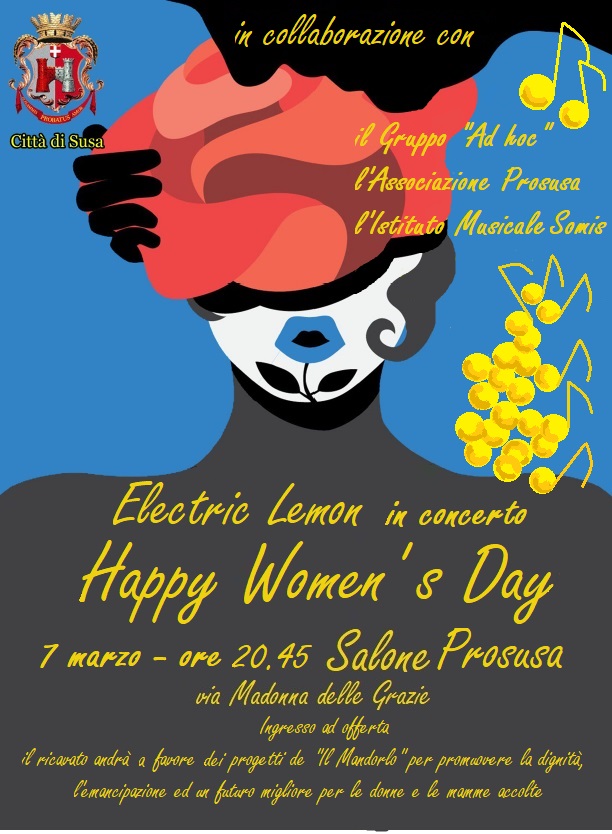 In occasione della festa della donna la Città di Susa organizza, in collaborazione con il Gruppo “Ad hoc”, l’Associazione Pro Susa e l’Istituto Musicale Somis per le ore 20.45 di giovedì 7 marzo, lo spettacolo “Happy Women's Day ” che si terrà presso il Teatro Pro Susa.