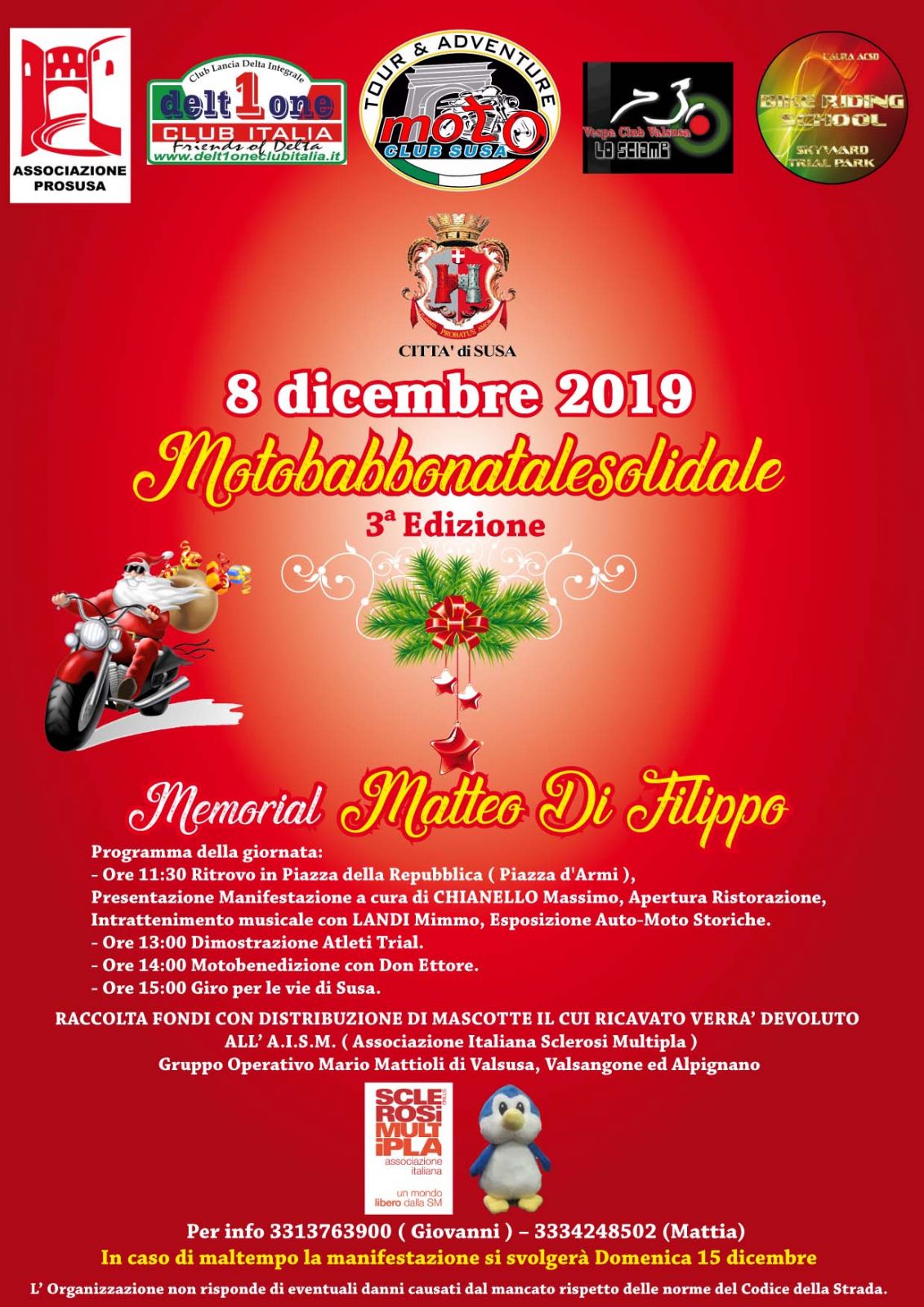 Domenica 8 dicembre avrà luogo la 3^ edizione della manifestazione "Motobabbonatalesolidale" - Memorial Matteo Di Filippo, a cura del Moto Club Susa, come da programma allegato.