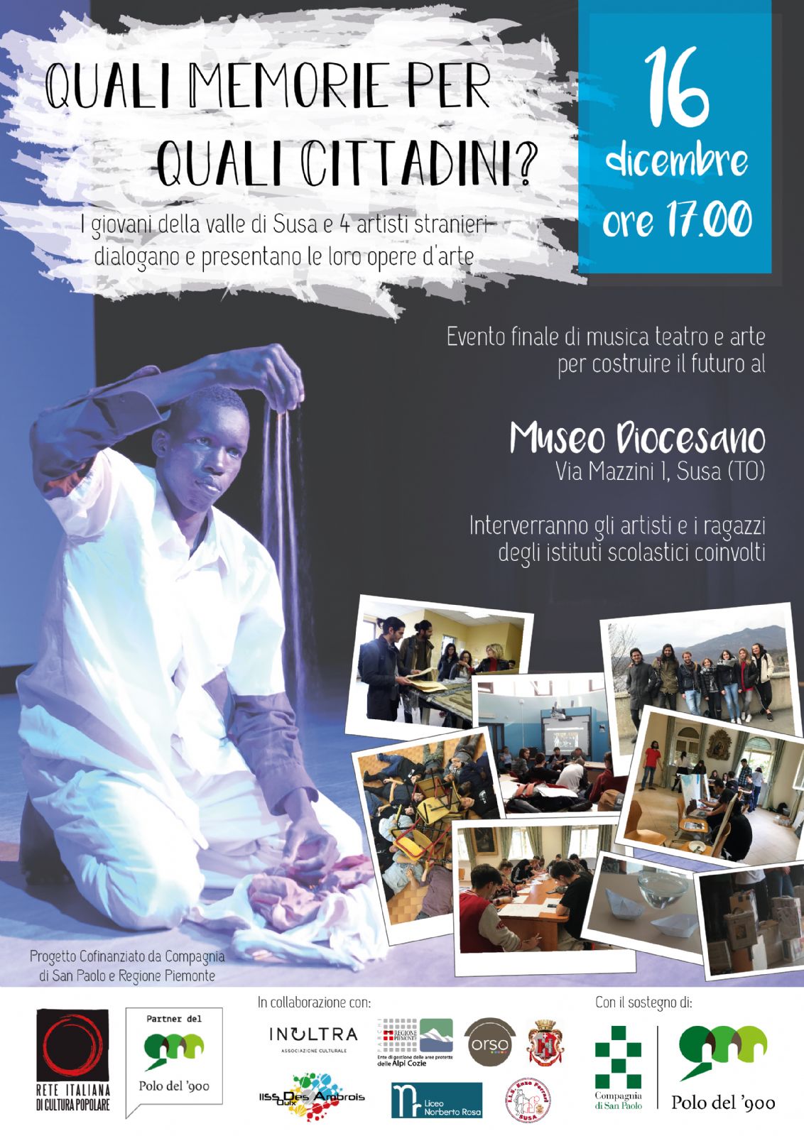 Domenica 16 dicembre avrà luogo l'evento finale di musica teatro e arte per costruire il futuro "Quali memorie per quali cittadini?" - I giovani della Valle di Susa e 4 artisti stranieri dialogano e presentano le opere d'arte.