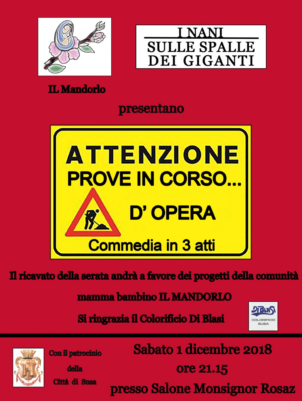 Sabato 1° dicembre, alle ore 21.15, presso il Salone Mons. Rosaz, l'Associazione I Nani sulle Spalle dei Giganti organizza la commedia in 3 atti "Attenzione prove in corso ... d'opera".