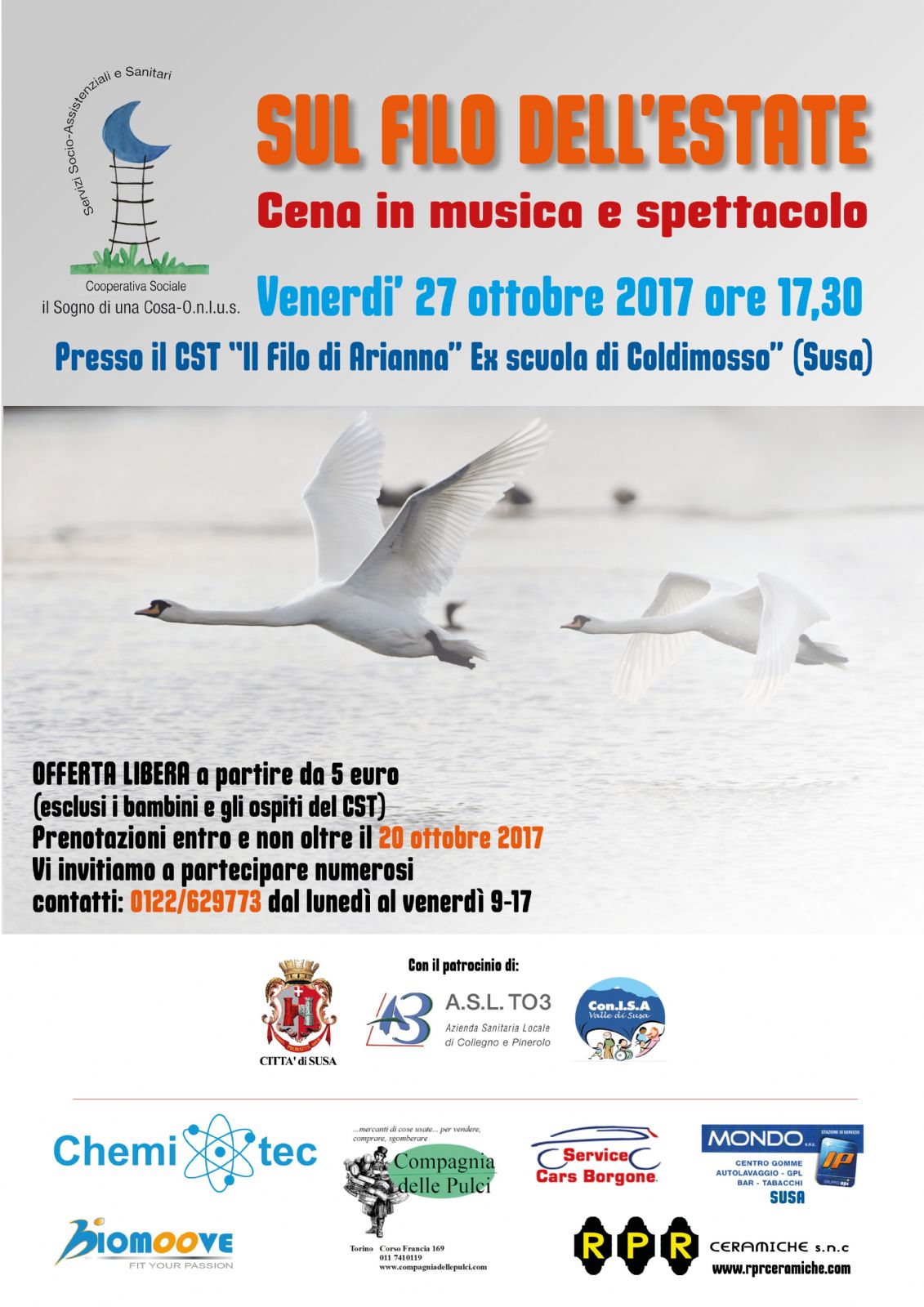 La Coop. Soc. "il Sogno di una Cosa" ha riprogrammato la festa "Sul filo dell'estate" (annullata a settembre per lutto di ospite inserita nella RAF di Sant'Antonino). La serata con apericena in musica e spettacolo avrà luogo venerdì 27 ottobre, a partire dalle ore 17.30, presso il Centro Socio Terapeutico di Coldimosso "Filo di Arianna", che accoglie persone con disabilità.