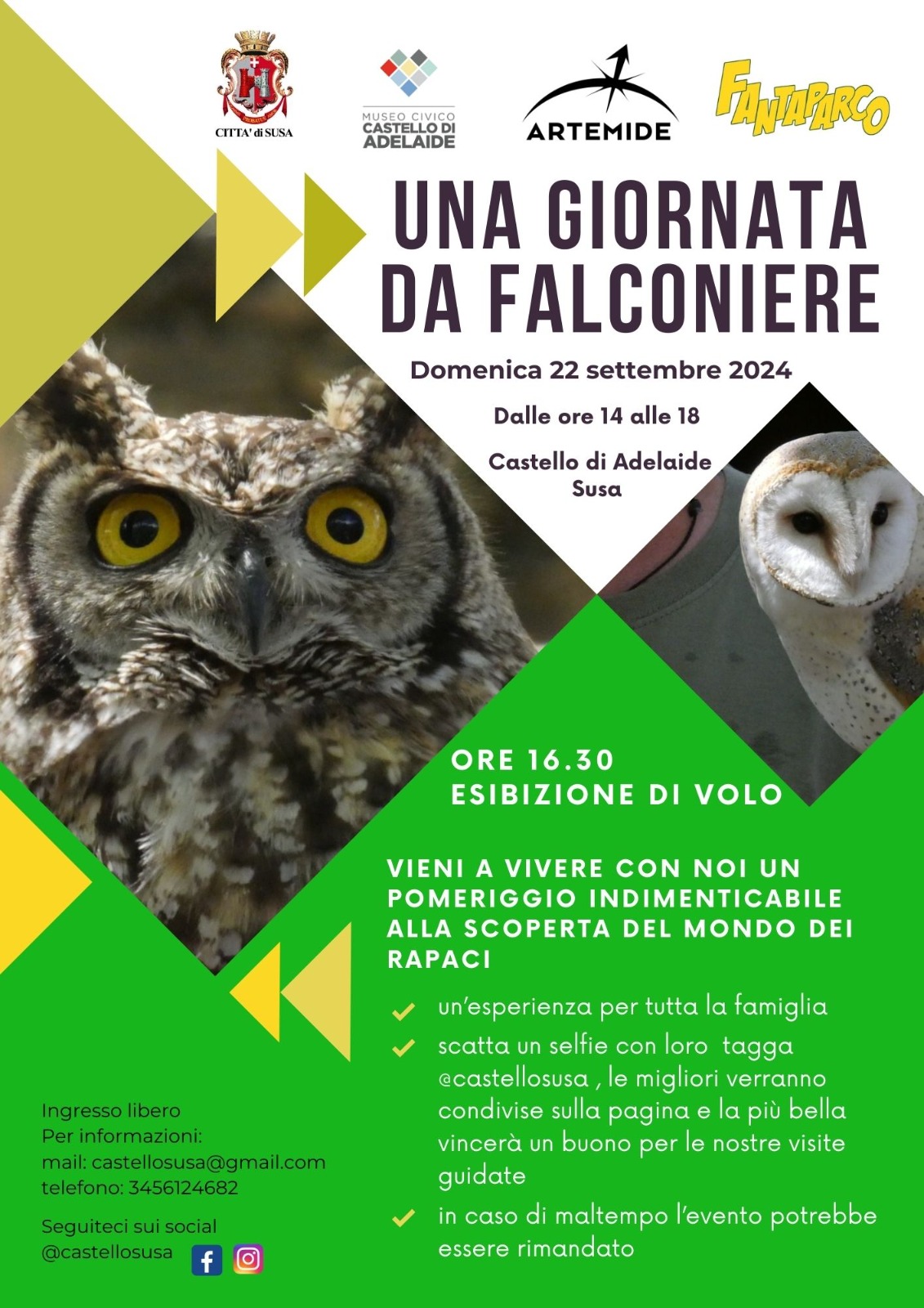 Le famiglie potranno scattare foto con i rapaci e partecipare al contest fotografico su Instagram: condividendo i loro scatti con l'hashtag #castellosusa e taggando @castellosusa, le foto migliori saranno pubblicate sulla pagina ufficiale, e il vincitore riceverà un buono per le visite guidate future.