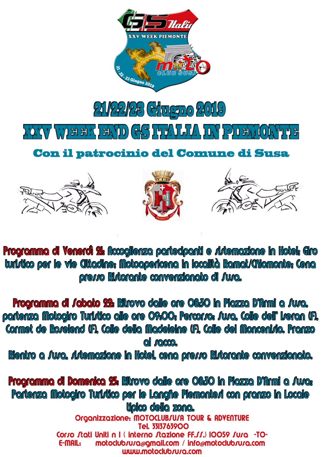 Da venerdì 21 a domenica 23 giugno Susa sarà punto di ritrovo, partenza e arrivo dei motogiri turistici previsti per il XXV week end GS Italia in Piemonte.